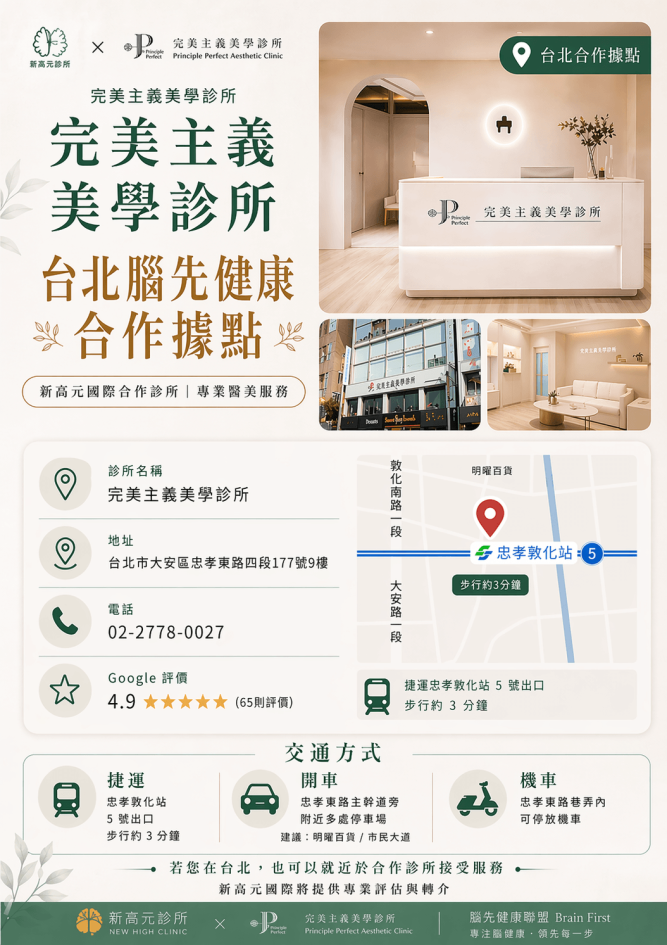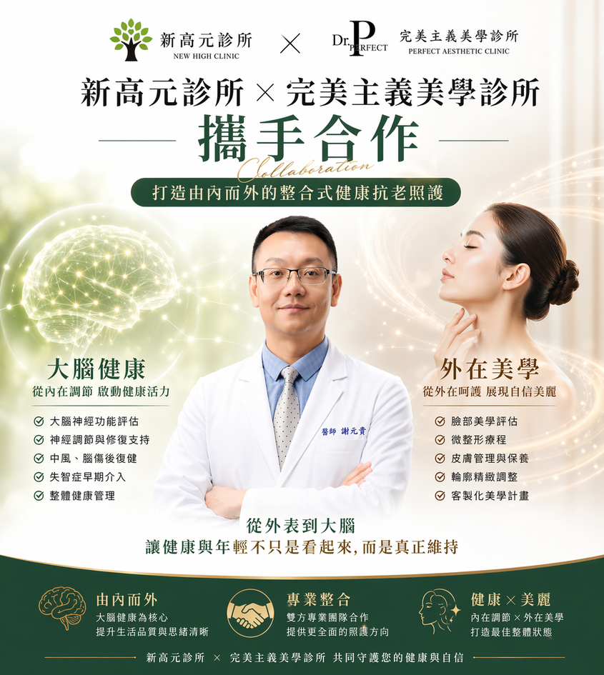 新高元診所正式與完美主義美學診所合作, 結合「外在美學」與「大腦健康」, 提供更完整的整合照護方向。