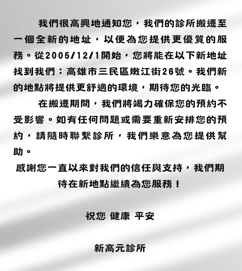 原 " 高雄元元診所" 搬遷至高雄市三民區嫩江街26號,並改名為 "新高元診所" 。