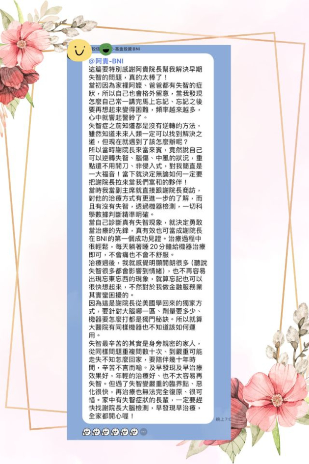 我在商會的場合中,接觸到新高元診所—謝元貴院長,做了腦功能檢測。檢測結果顯示,我有輕度認知功能障礙的傾向,還不到失智,但已經是一個警訊。那一刻我反而鬆了一口氣,因為不是我想太多,而是真的有原因。