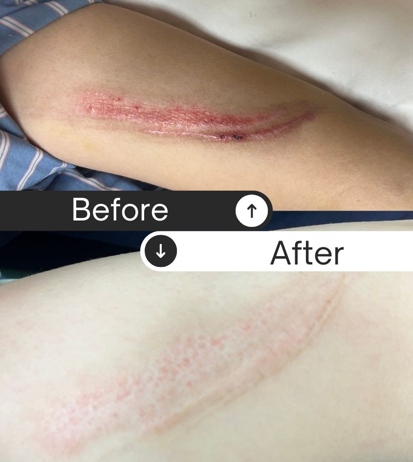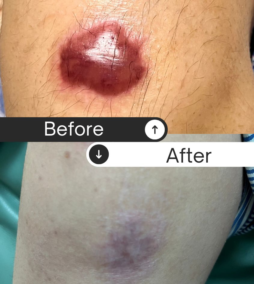 從這位患者的紀錄可以看到,治療前疤痕紅腫、顏色較深且有明顯隆起;經過一段時間的高壓氧療程後,顏色逐漸淡化,腫脹感減少,摸起來也比較柔軟。每個人的體質與傷口狀況不同,改善程度會有差異,因此仍需要醫師評估是否適合。
